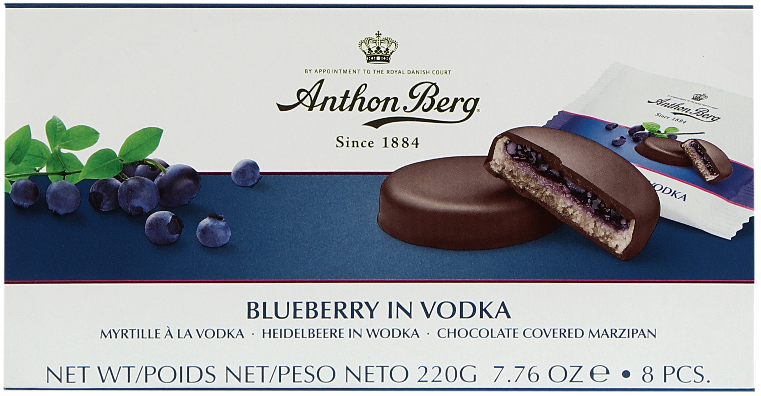 AB040Anthon Berg - marcipán v čokoládě - borůvky ve vodce 220g
